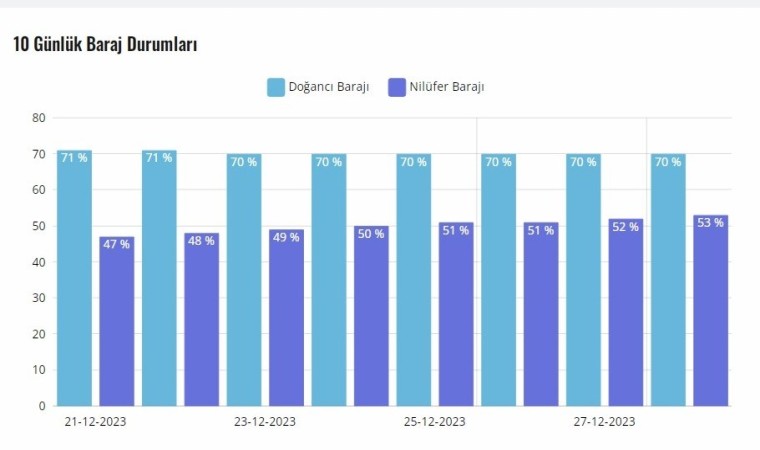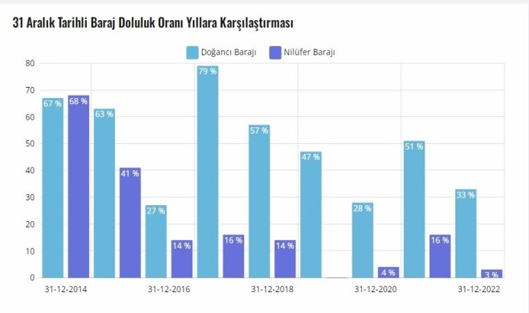 Bursa’da sıcaklıklar mevsim normallerinin üzerinde seyretse de Doğancı ve Nilüfer barajları doluluk oranı yıllar sonra en iyi seviyesine ulaştı. En son 2014 yılının 31 Aralık tarihinde iki barajın ortalama su seviyesi yüzde 67.5 olurken, geçen yıl yüzde 33 doluluk oranına sahip Doğancı Barajını besleyen Nilüfer Barajında su seviyesi yüzde 3, ortalama doluluk oranı ise 16.5’i gösteriyordu.