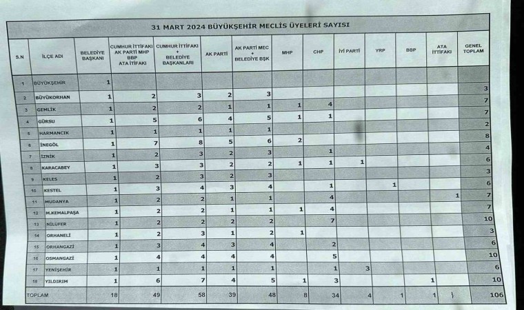 Büyükşehir Belediyesi ve 17 ilçenin başkanları belli olurken Bursa Büyükşehir Belediye Meclisindeki üyelerin partilere göre dağılımı belli oldu.