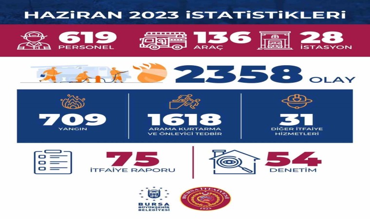 Bursa’da 28 istasyonda 619 personel, 136 araçla hizmet veren Büyükşehir Belediyesi İtfaiye Daire Başkanlığı’na bağlı ekipler, haziran ayında 709 yangın, bin 618 arama kurtarma ve önleyici tedbir, 31 diğer itfaiye hizmetleri olmak üzere 2 bin 538 olaya müdahale etti. Olaylarla alakalı 75 itfaiye raporunun hazırlandığı haziran ayında, 54 denetim gerçekleştirdiğini bildirdi.