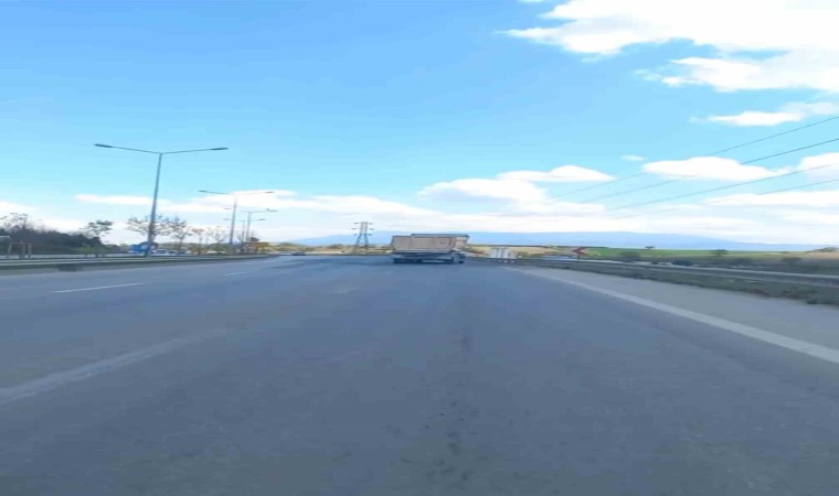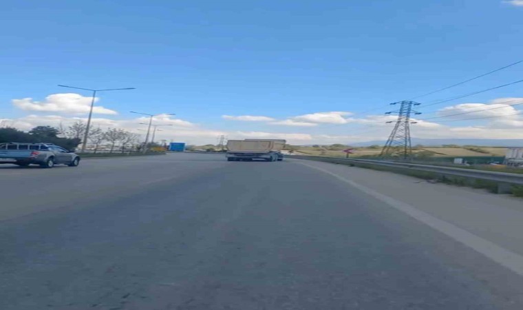 Bursa’da trafikte seyreden aksı yamuk tırı gören diğer sürücüler gördükleri karşısında hayrete düştü.