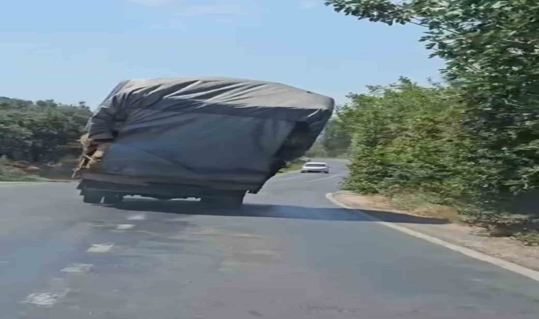 Bursa’da aşırı yük yüklenen kamyonetin tehlikeli yolculuğu kameralara yansıdı. Kendi yüksekliğinin katı kadar yükle caddelerde seyreden kamyonet, virajlarda da devrilme tehlikesi yaşadı.