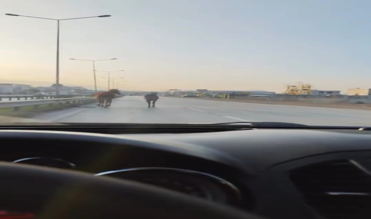 Bursa’da başıboş atlar anayolda tehlike saçtı. Sürücülerin dikkati sayesinde muhtemel bir kaza yaşanmazken, atların şeritleri işgal ettiği anlar kameraya yansıdı.