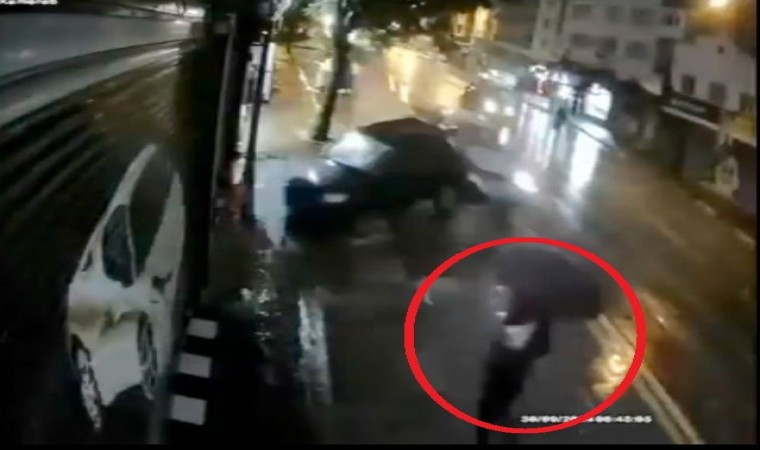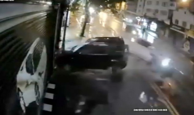 Bursa seyir halindeki pikap, park edilmiş haldeki hafif ticari araca çarptı. Kaza anında kaldırım üzerinde bulunan yaya, aracın altında kalmaktan son anda kurtuldu. O anlar bir işyerinin güvenlik kamerasına yansıdı.