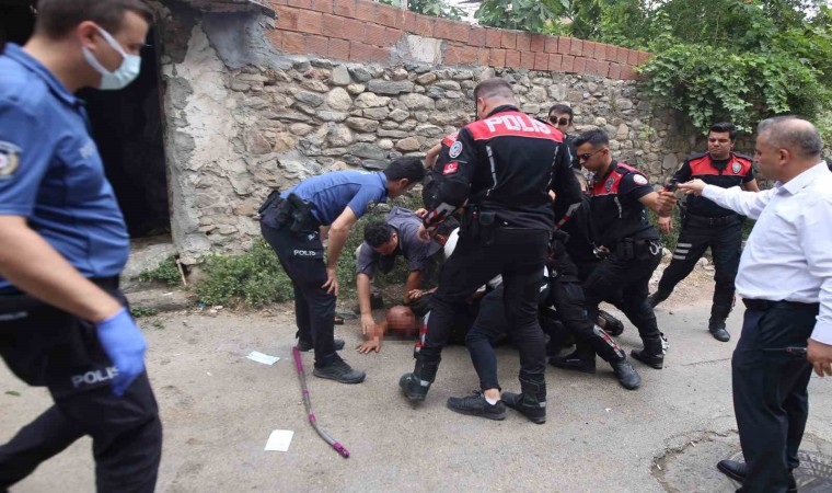 Polisler, direnmeye devam eden Feyzullah Y’yi, pencerenin kırık camından sıktıkları biber gazıyla etkisiz hale getirmek istedi. Yaşlı adam, elindeki bıçakla dışarı çıkıp, ekiplere saldırmaya devam etti. Bıçağın elinden düşmesiyle yakalanan Y. tedbir amaçlı Çekirge Devlet Hastanesine kaldırıldı.