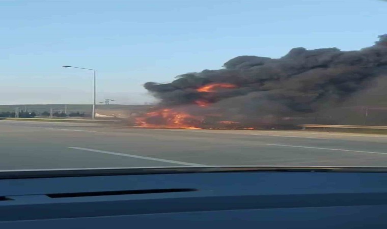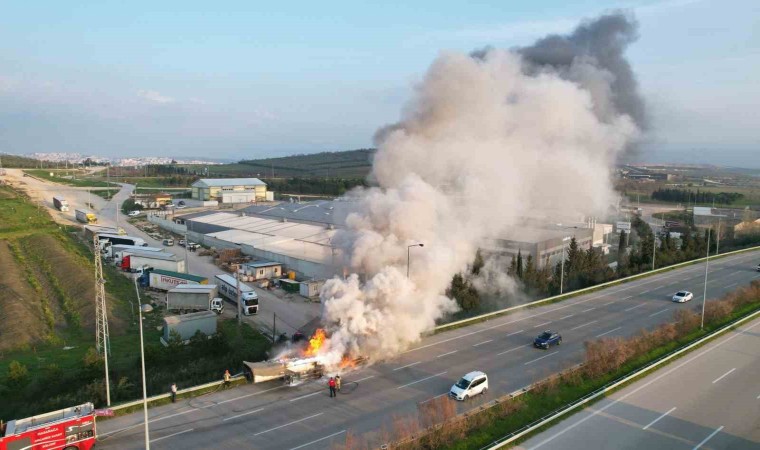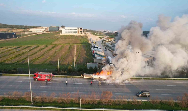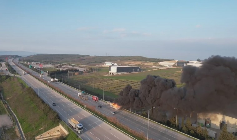 Bursa’da devrilen tırın dorsesi alev alev yanarken o anlar dron ile görüntülendi.