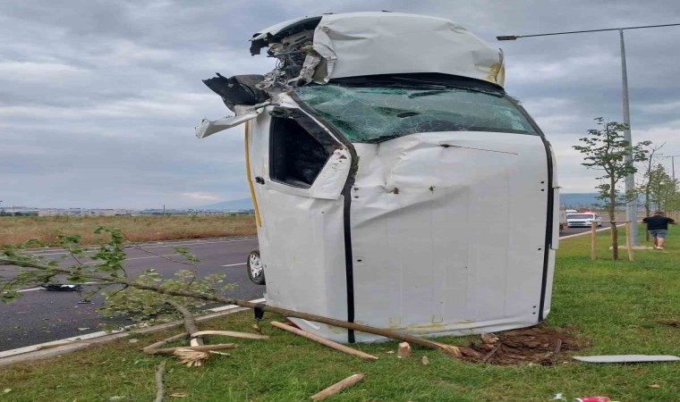 Kaza, Bursa'nın Nilüfer ilçesindeki Özlüce mevkisinde meydana geldi. Hafif ticari araç, yağış nedeniyle kayganlaşan yolda kontrolden çıkarak yol kenarındaki aydınlatma direğine çarptı ve havada döndükten sonra dikey bir şekilde durdu. Çevredekiler, bu olay karşısında şaşkınlık yaşarken, kaza anı hemen 112 Acil Çağrı Merkezi'ne bildirildi.