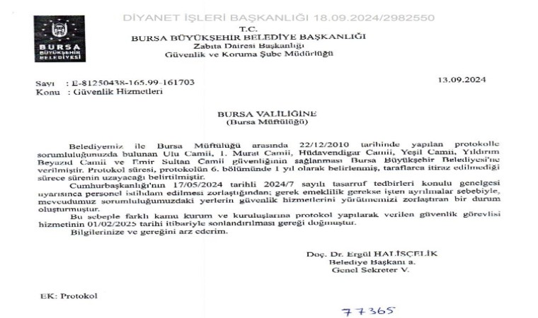 Bursa Valiliği ve Bursa Müftülüğüne 13.09.2024 tarihinde Bursa Büyükşehir Belediyesi Zabıta Daire Başkanlığı ve Güvenlik ve Koruma Şube Müdürlüğü tarafından gönderilen ek protokol yazısında Cumhurbaşkanlığının 17/05/2024 tarihli 2024/7 sayılı tasarruf tedbirleri konulu genelgesi uyarısınca personel istihdam edilmesi zorlaştığından; gerek emeklilik gerek se işten ayrılmalar sebebiyle mevcudumuz sorumluluğumuzdaki yerlerin güvenlik hizmetlerini yürütmemizi zorlaştıran bir durum oluşmuştur. Bu sebeple farklı kamu kurum ve kuruluşlarına protokol yapılarak verilen güvenlik görevlisi hizmetinin 01/02/2025 tarihi itibariyle sonlandırılması gereği doğmuştur" denildi.