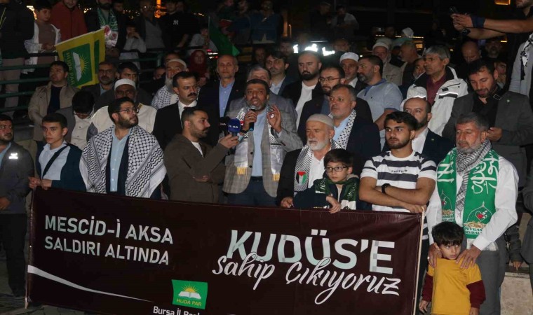 Hüda-Par Bursa İl Başkanlığı, Ulu Cami’de kılınan yatsı namazının ardındın ’Özgür Kudüs buluşması’ düzenledi. Etkinliğe Hüda-Par Bursa İl Başkanı Mehmet Şimşek, Saadet Partisi Bursa İl Başkan Yardımcısı İkram Akkaya, Hüda-Par Yıldırım İlçe Başkanı Veysel Aymelek ve vatandaşlar katıldı. Filistin’e destek sloganlarının atıldığı etkinlikte basın açıklaması gerçekleştiren Aymelek, Filistinlilerin yalnız bırakılmamasını vurgulayarak "Filistin’i, başkenti Kudüs olan, doğusu ve batısıyla bölünmez bir bütün ve İslam’ın mukaddes toprakları olarak görüyoruz” ifadelerini kullandı.