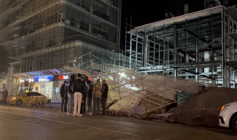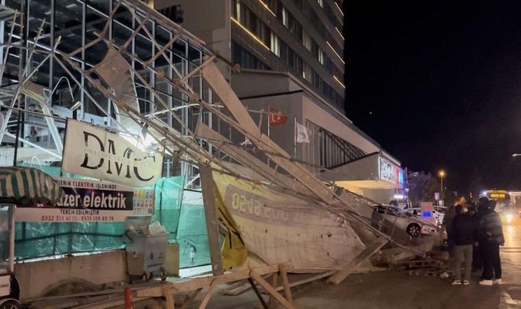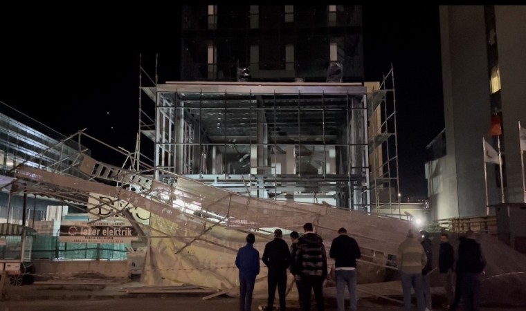 Bursa’da etkisini gösteren şiddetli rüzgâr inşaatı devam eden bir binanın iskelesini devirdi. Gece saatleri olması nedeniyle şans eseri yaralanan olmazken, fırtına ağaçları yerinden söktü, araçlar zarar gördü.