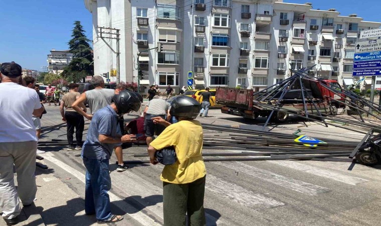 Bursa’da freni patlayan kamyon 2 araç ve 1 motosiklete çarptı. Kazada kamyon üzerindeki demir profillerin üzerine düştüğü biri yaya toplam 2 kişi yaralandı.