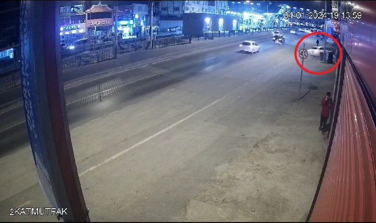 Kaza anı, yol üzerinde bulunan farklı bir iş yerinin güvenlik kamerasına yansıdı. Görüntülerde, 27 AUE 616 plakalı otomobilin bir anda sağa kırarak iş yerine doğru gittiği, bu sırada kaldırımda yürüyen bir kişinin saniyeler ile ölümden döndüğü kaydedildi.