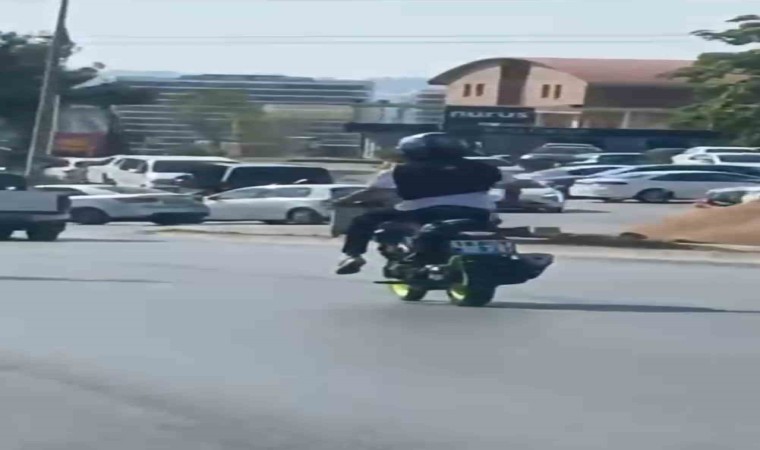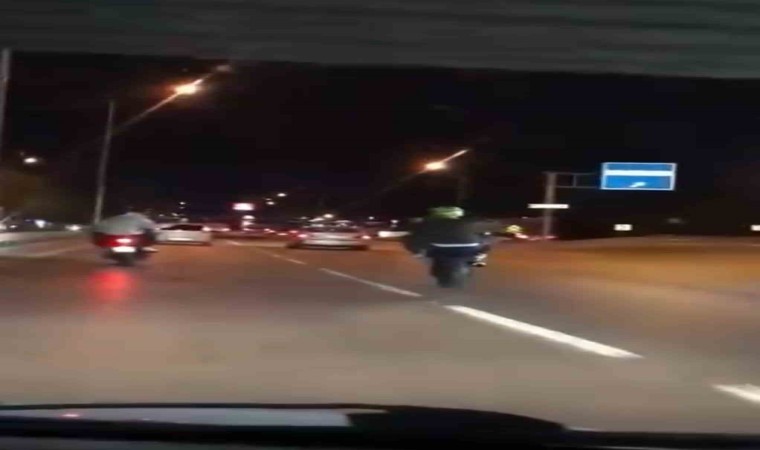 Bursa’da motosiklet sürücüsünün ön kaldırarak tehlikeli seyretmesi başka bir sürücü tarafından kaydedildi.