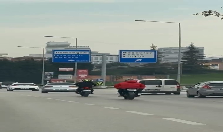 Edinilen bilgiye göre, trafikte motosiklet ile ön tekerleği kaldırıp tehlikeli hareketler yapan motosikletli iki kafadar, diğer sürücülerin yüreklerini ağzına getirdi. Bir süre tehlikeli seyreden motosikletler, daha sonra farklı caddelere girerek gözden kaybolurken o anlar trafikteki başka bir sürücünün kamerasına yansıdı.