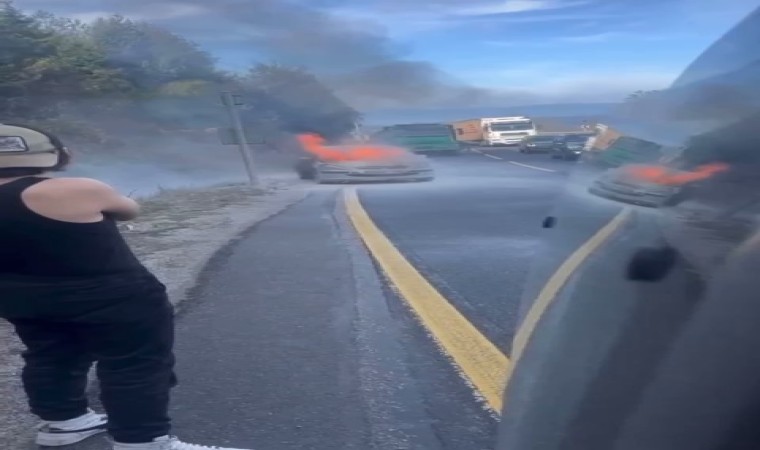 Bursa’da seyir halindeki otomobilden duman çıktığını gören sürücü, aracını hemen emniyet şeridine çekti. Araç kısa süre içerisinde tutuşarak alev topuna döndü.