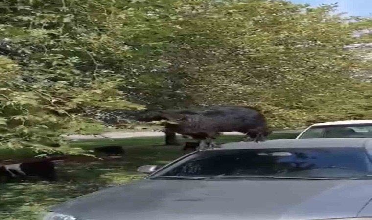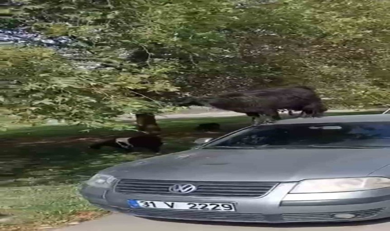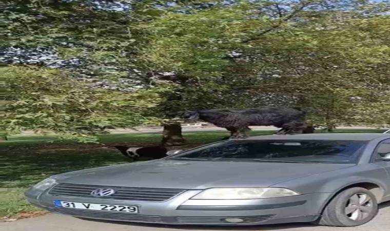 Bursa’da dışarıda otlayan keçiler, bir otomobilin üzerine çıkarak ağaç yapaklarını yedi.