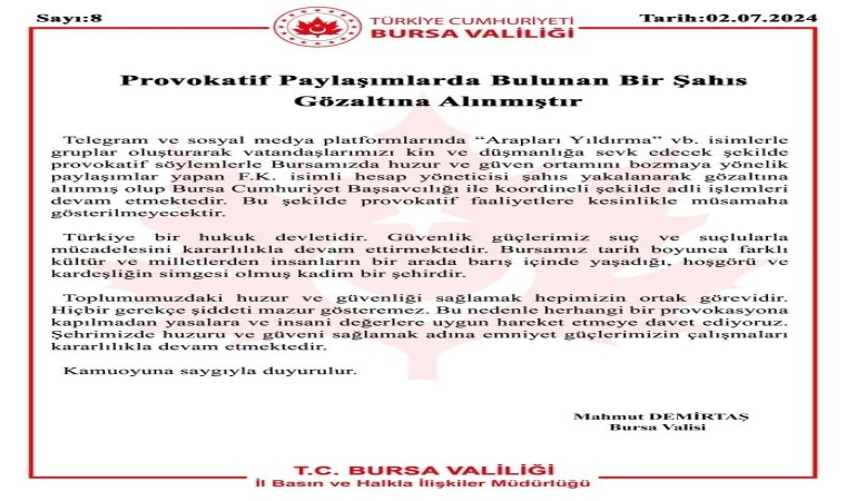 Bursa Valiliği tarafından yapılan açıklama şu şekilde, "Çeşitli sosyal medya platformlarında "Arapları Yıldırma" vb. isimlerle gruplar oluşturarak vatandaşlarımızı kin ve düşmanlığa sevk edecek şekilde provokatör söylemlerle Bursa’mızda huzur ve güven ortamını bozmaya yönelik paylaşımlar yapan F.K. isimli hesap yöneticisi yakalanarak gözaltına alınmış olup Bursa Cumhuriyet Başsavcılığı ile koordineli şekilde adli işlemleri devam etmektedir. Bu şekilde provokatör faaliyetlere kesinlikle müsamaha gösterilmeyecektir. Türkiye bir hukuk devletidir. Güvenlik güçlerimiz suç ve suçlularla mücadelesini kararlılıkla devam ettirmektedir. Bursa’mız tarih boyunca farklı kültür ve milletlerden insanların bir arada barış içinde yaşadığı, hoşgörü ve kardeşliğin simgesi olmuş kadim bir şehirdir. Toplumumuzdaki huzur ve güvenliği sağlamak hepimizin ortak görevidir. Hiçbir gerekçe şiddeti mazur gösteremez. Bu nedenle herhangi bir provokasyona kapılmadan yasalara ve insani değerlere uygun hareket etmeye davet ediyoruz. Şehrimizde huzuru ve güveni sağlamak adına emniyet güçlerimizin çalışmalarını kararlılıkla devam etmektedir. Kamuoyuna saygıyla duyurulur.’ denildi.