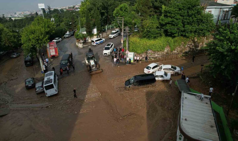 Bursa’da aniden bastıran yağış hayatı olumsuz etkilerken, Uludağ’ın eteklerinde taşan dereler ise park halindeki otomobilleri önüne katıp sürükledi. Taşan derenin etkileri havadan görüntülendi. Bursa Büyükşehir Belediyesi tarafından yapılan açıklamada metrekare başına 41 kilogram yağış düştüğü belirtilirken, acil durum haricinde trafiğe çıkılmaması uyarısı yapıldı.