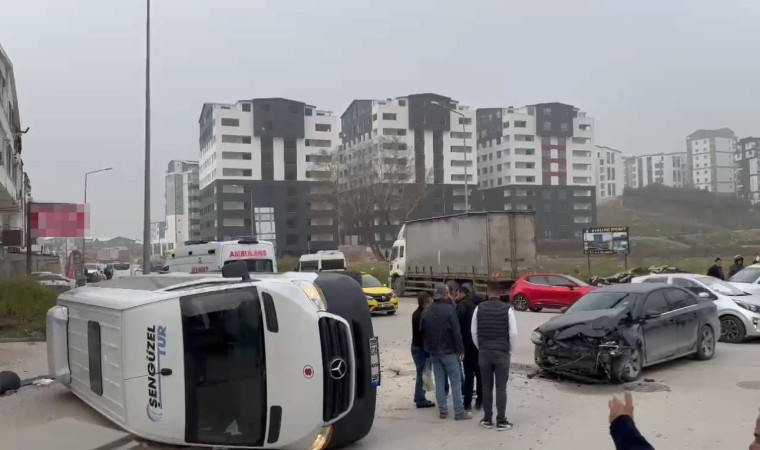 Bursa’da otomobil ile çarpışan servis minibüsü aracı yan yattı. Servis minibüsünün boş olması faciayı önledi.