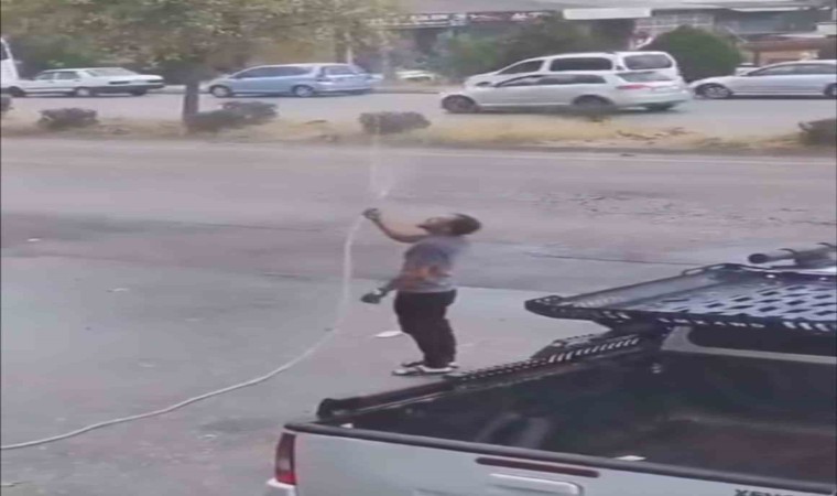 Bursa’da sıcaktan bunalan bir vatandaş, hortumla kendini serinletmeye çalıştı.