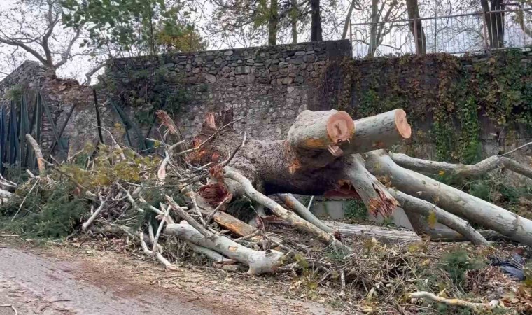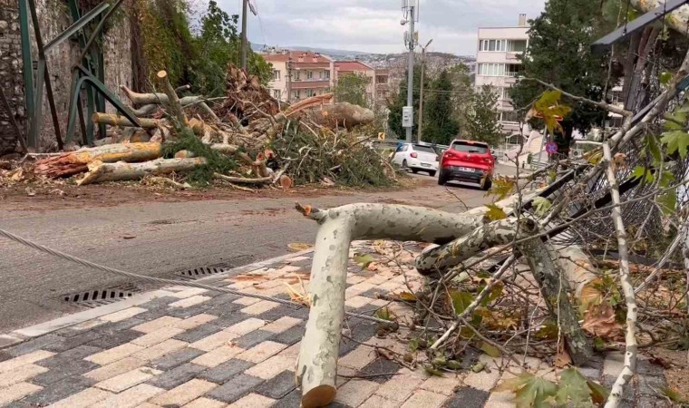 Bursa’da Meteoroloji Genel Müdürlüğü’nün uyarılının ardından şiddetli rüzgar dün gece itibariyle etkisini gösterdi. Kent merkezinde hayatı olumsuz etkileyen fırtına önüne geleni uçurdu. Bursa’da 510 yıllık geçmişi bulunan tarihi Hüsnügüzel Kaplıcası’nın bahçesindeki 250 yıllık anıt çınar ağacı fırtınaya dayanamadı. Saatteki hızı 100 kilometreye ulaşan fırtına sebebiyle devasa çınar kökünden koparak yola devrildi. O anlar bir apartmanın güvenlik kamerasına anbean yansırken, ekipler ağacın dallarını keserek trafiği açtı .Çınar ağacı eski Askeri Hastanenin duvarında da hafif hasara yol açtı.