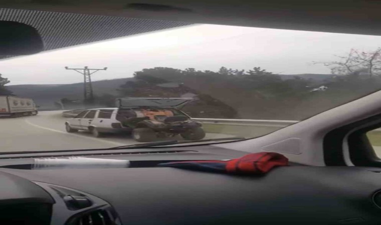 Bursa’da bir sürücünün aracının arkasına koyduğu ATV’yi tehlikeli şekilde taşırken ki anları başka bir sürücünün cep telefonu kamerasına yansıdı.