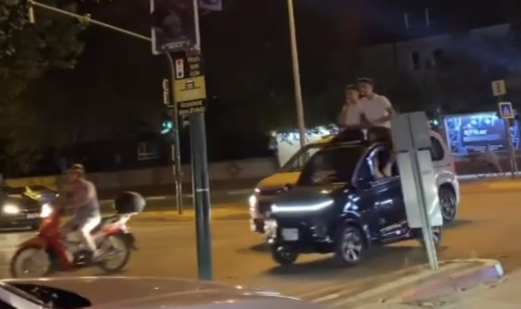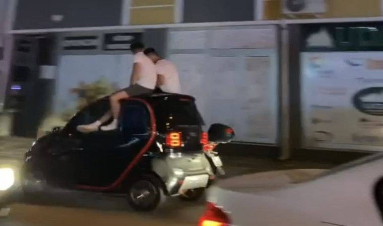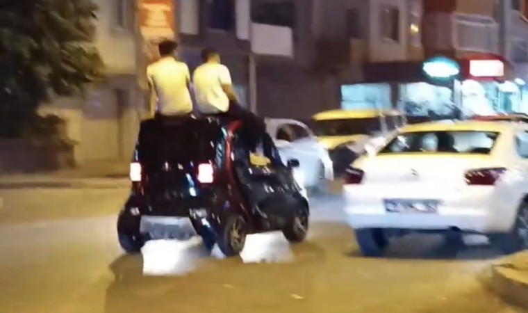 Bursa’nın İnegöl ilçesinde gençlerin elektrikli araç üzerinde seyretmeleri amatör kameraya yansıdı.