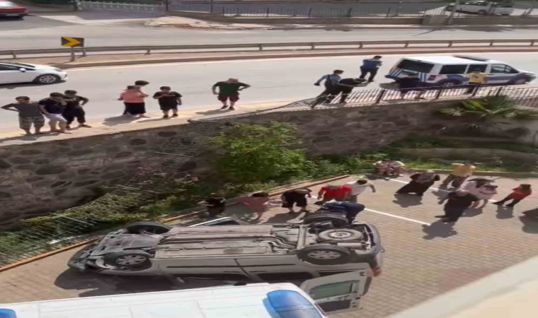 Bursa’da virajı alamayarak site bahçesine uçan hafif ticari araçta bulunan 3 kişi yaralandı.