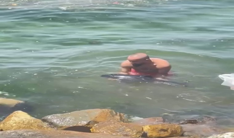 Bursa’nın Kurşunlu sahilinde ağ atan balıkçıların ağına yavru yunus balığı takıldı. Çırpınan yunusu fark eden balıkçılardan biri hemen suya atlayıp, yunus balığını kurtarmak için seferber oldu. Dakikalarca uğraşan balıkçı, yunus balığını ağdan kurtarıp tekrar denize bıraktı. Yunus balığının kurtarılma anı ise kameraya yansıdı.