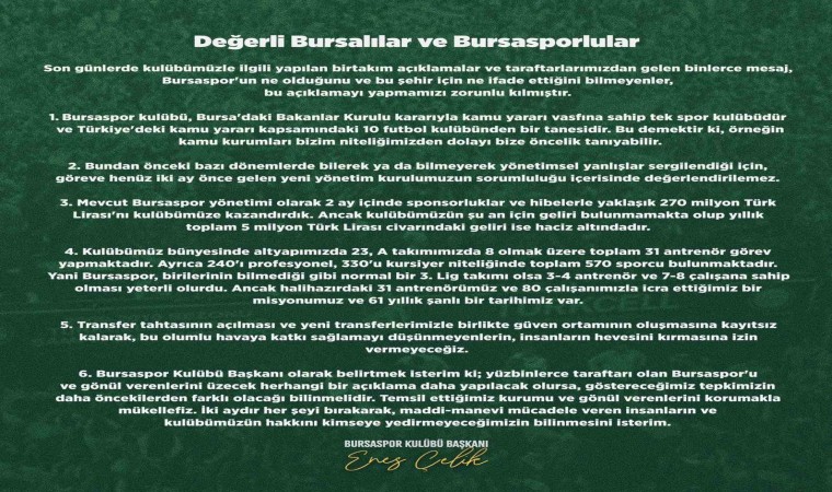 Bursaspor Başkanı Enes Çelik’in sosyal medya hesabından yaptığı açıklama şu şekilde: "Değerli Bursalılar ve Bursasporlular... Son günlerde kulübümüzle ilgili yapılan birtakım açıklamalar ve taraftarlarımızdan gelen binlerce mesaj, Bursaspor’un ne olduğunu ve bu şehir için ne ifade ettiğini bilmeyenler, bu açıklamayı yapmamız’ zorunlu kılmıştır.