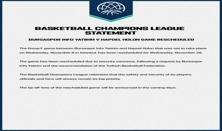 Basketbol Şampiyonlar Ligi’nde çarşamba günü oynanacak olan Bursaspor İnfo Yatırım - Hapoel Holon müsabakası, güvenlik sebepleri nedeniyle 29 Kasım Çarşamba gününe ertelendi. Yapılan açıklamada, Bursaspor ve Türkiye Basketbol Federasyonu’nun tavsiyesi üzerine bu kararın alındığı belirtildi. Ayrıca açıklamada; oyuncuların, emniyet yetkililerinin ve taraftarın güvenliğinin, Basketbol Şampiyonlar Ligi’nde her zaman ön planda tutulacağı ifadeleri yer aldı.
