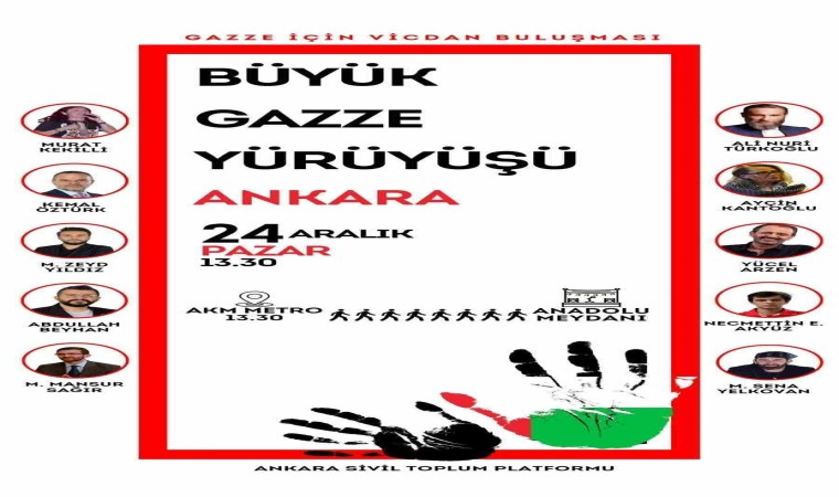 Ankara Filistin Dayanışma Platformu, İsrail’in Gazze’ye yönelik saldırılarını 24 Aralık’ta düzenleyeceği ‘Büyük Gazze Yürüyüşü’ ile protesto edecek. Saat 13.30’da AKM Metro İstasyonu’nda başlayacak yürüyüş, Anadolu Meydanı’nda bitecek. Ardından Anadolu Meydanı’nda miting gerçekleştirilecek. Filistinli ailelerin de katılacağı yürüyüş sonrası mitingde sanatçılar, sporcular ve bazı sivil toplum kuruluşları (STK) İsrail’in Gazze’ye yönelik saldırılarını protesto edecek.