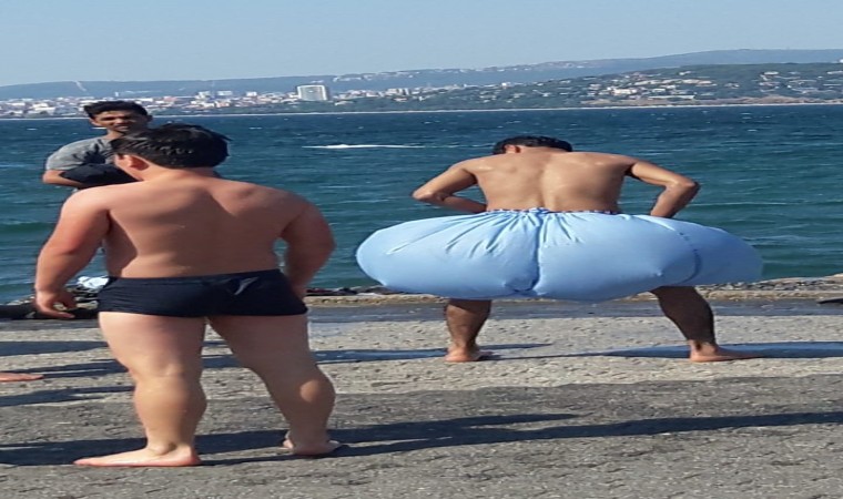 BÜYÜKADA SAHİLİNDE İLGİNÇ GÖRÜNTÜ: NAYLON TORBA İLE DENİZE GİRDİLER