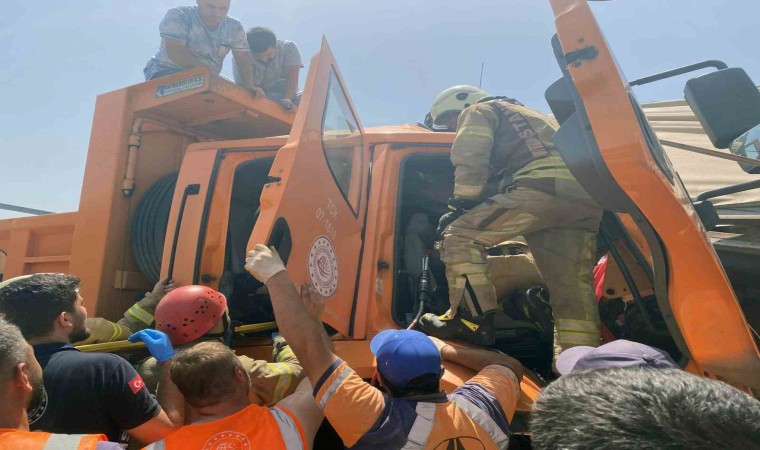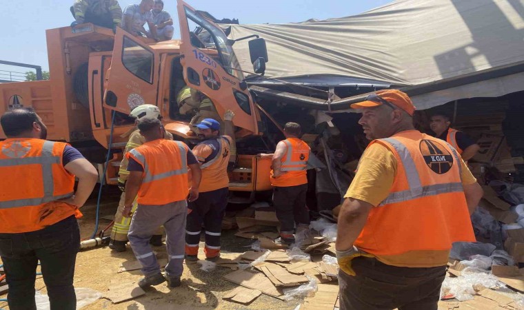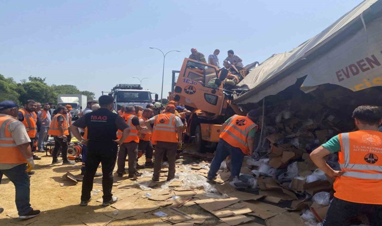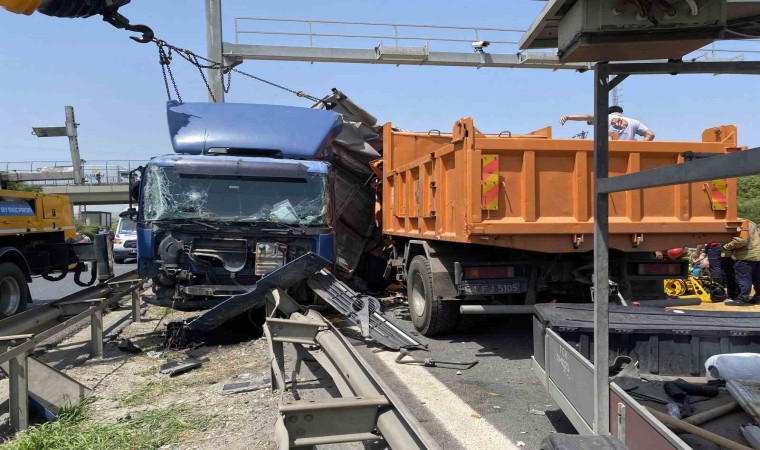 Büyükçekmece TEM otoyolunda kontrolden çıkan ip yüklü kamyon, bariyerleri aşarak karşı yönde bayram öncesi temizlik çalışması yapan Karayolları Genel Müdürlüğü’ne (KGM) bağlı kamyona çarptı. Kamyon sürücüsü araç içinde sıkışırken, itfaiye tarafından yaralı olarak kurtarıldı.
