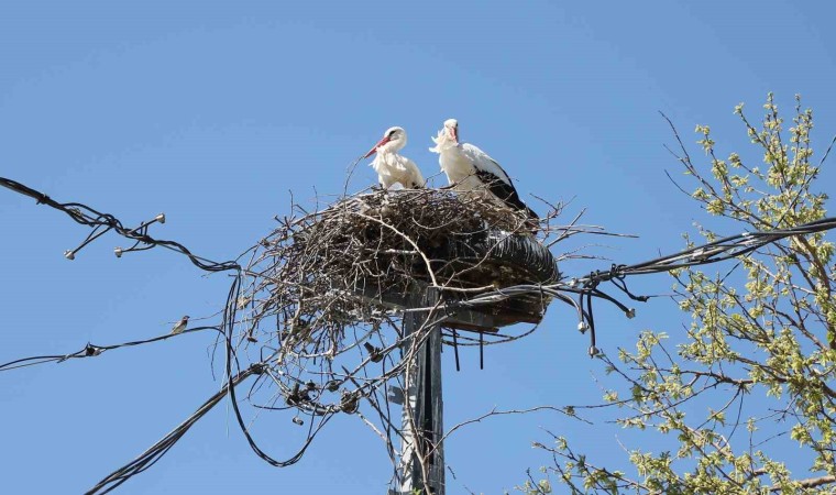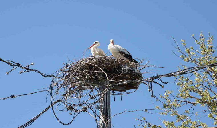 Yaklaşık 20 yıldır Büyükçekmece ilçesinin Karaağaç Mahallesi’nde elektrik direğinin üstüne yuva yapan leylekler, yol genişletme çalışmasının ardından korunan yuvalarına bu yıl yeniden geldi.