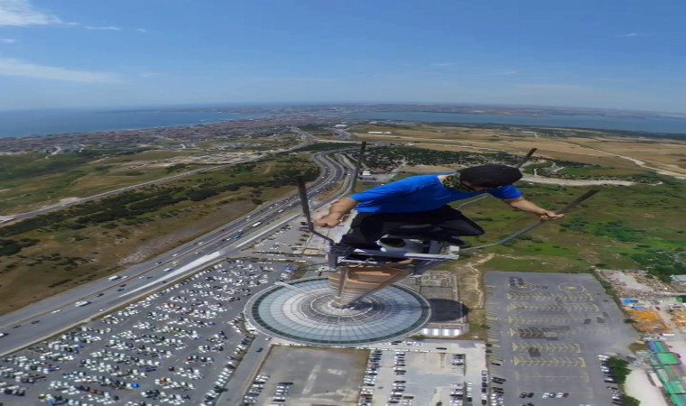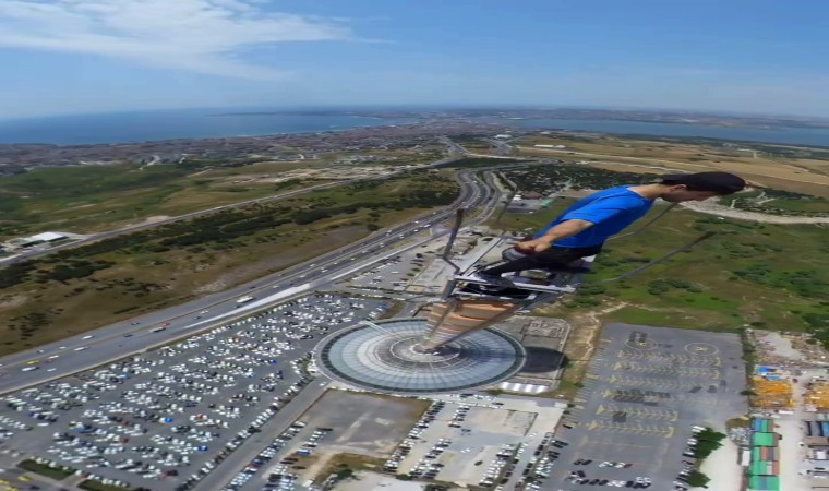 Büyükçekmece’de atıl durumdaki 230 metre yükseklikte olan televizyon kulesinin en tepesindeki antene çıkan genç yürekleri ağza getirirken, o anları kaydedip sosyal medya hesabında da paylaştı.