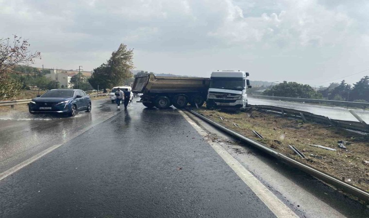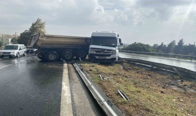 Büyükçekmece E-5 Güzelce mevkiinde şiddetli yağış nedeniyle kayganlaşan yolda kontrolden çıkan hafriyat kamyonu, bariyerleri aşarak ters istikamete döndü. Facianın eşiğinden dönülen kazada ölen ya da yaralanan olmazken, kaza anı güvenlik kamerasına yansıdı.
