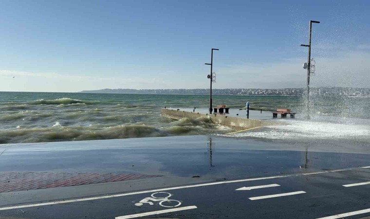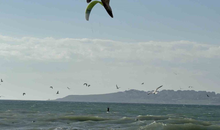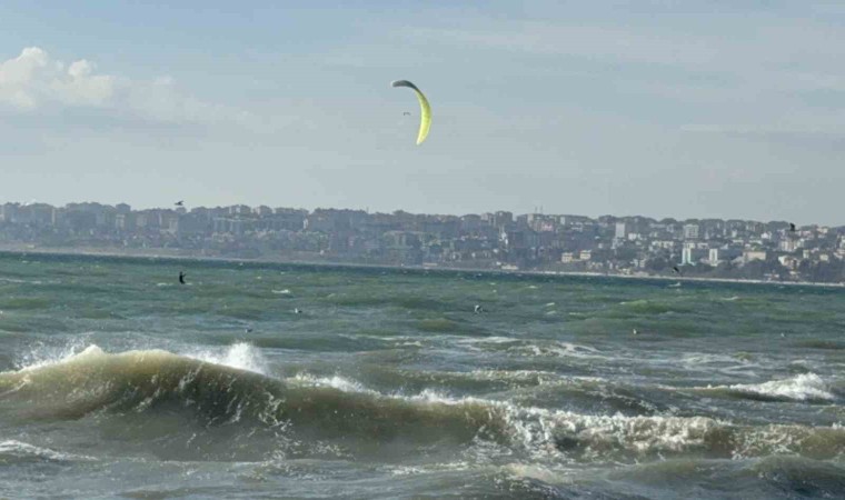 İstanbul Büyükçekmece’de etkili olan lodos nedeniyle denizde yüksek dalgalar oluştu. Bir kişi ise dalgalar arasında sörf yaptı.