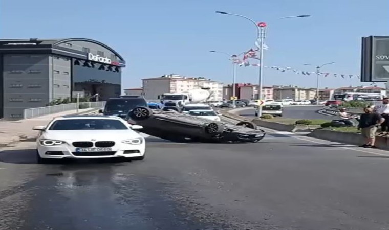 Büyükçekmece’de düz yolda ilerlediği sırada kaldırıma vuran otomobil devrildi. Kaza anı güvenlik kamerasına yansırken, kadın sürücü kendi imkanlarıyla arabadan çıktı.