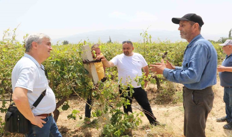 Manisa’nın Alaşehir ilçesinde geçtiğimiz günlerde yaşanan sağanak yağış ve dolu, ilçede hayatı olumsuz etkiledi. Üzüm bağlarında ve ova yollarında maddi zarara neden olan afetin ardından Manisa Büyükşehir Belediyesi Kırsal Hizmetler Dairesi Başkanı Yılmaz Usta, Manisa Büyükşehir Belediyesi Yol Yapım, Bakım ve Onarım Dairesi Başkanlığı Şube Müdürü Serdinç Bulut ve Alaşehir Belediye Başkanı Ahmet Öküzcüoğlu, afetten etkilenen vatandaşları ziyaret etti. Manisa Büyükşehir Belediye Başkanı Ferdi Zeyrek’in geçmiş olsun dileklerini ileten Başkan Öküzcüoğlu ve Büyükşehir ekipleri, yaşanan afetten zarar gören üzüm bağları ile ova yollarında incelemelerde bulundu.