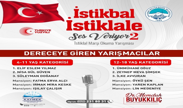 Kayseri Büyükşehir Belediyesi KAYMEK A.Ş. tarafından 12 Mart İstiklal Marşı’nın kabulü yıl dönümü kapsamında ‘İstikbal İstiklale Ses Veriyor’ sloganıyla düzenlenen ve toplam 837 gencin katıldığı 2’nci İstiklal Marşı Okuma Yarışması’nda kazananlar belli oldu.