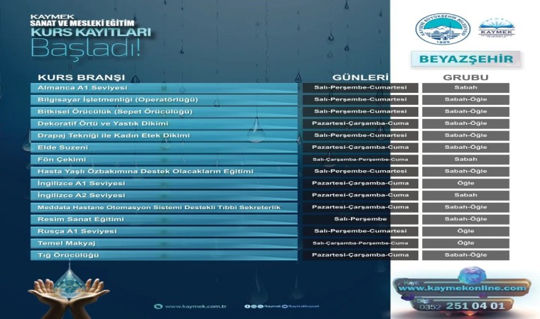 Bu kapsamda KAYMEK, Sanat ve Mesleki Eğitim Kurs kayıtlarını 13 Ocak itibariyle başlattı. Vatandaşların ilgi duyduğu, becerisini geliştirmek istediği alanlar ya da yeteneklerini keşfetmek istediği kurslar, KAYMEK tarafından etkin ve kaliteli bir şekilde Büyükşehir Belediyesi’nin kentin muhtelif bölgelerindeki tam donanımlı tesislerinde veriliyor.