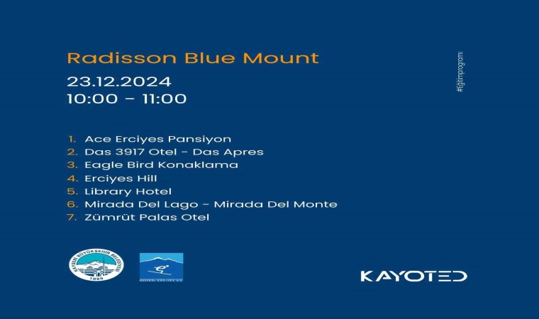 Her gün farklı bir otelde düzenlenecek faaliyetler 3 gün sürecek. Program kapsamında, Erciyes Kayak Merkezi ve özellikle Kültür Yolu sunumları gerçekleştirilecek. Çalışmalar 23-25 Aralık 2024 tarihleri arasında yapılacak.