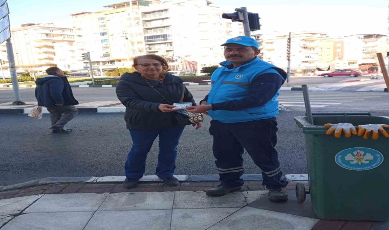 Manisa Büyükşehir Belediyesi Çevre Koruma ve Kontrol Dairesi Başkanlığı’na bağlı çalışan temizlik personelinin dikkati ve duyarlılığı sayesinde bulunan cüzdan sahibine teslim edildi.