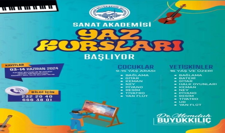 Kayseri Büyükşehir Belediyesi Sanat Akademisi Yaz Kursları kayıtları başlıyor. 3 Haziran Pazartesi günü başlayacak kayıtlar için son tarih 14 Haziran Cuma günü olarak belirlendi.