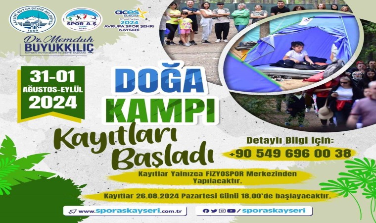 26 Ağustos 2024 Pazartesi Günü saat 18.00’de başlayan ve yalnızca Fizyospor Merkezi’nden (Kayseri Büyükşehir Belediyesi yanı) alınan kayıtlar için şartlar, 0-6 yaş için ücretsiz, 7-13 yaş için 500 TL, 14 yaş ve üzeri için 600 TL olarak belirlendi. Doğanın kalbinde unutulmaz bir hafta sonu geçirmek isteyen vatandaşlar için muhteşem bir imkan sunan Büyükşehir Belediyesi Spor A.Ş., doğa kampları için spor ve eğlence dolu bir etkinlik programı hazırladı.