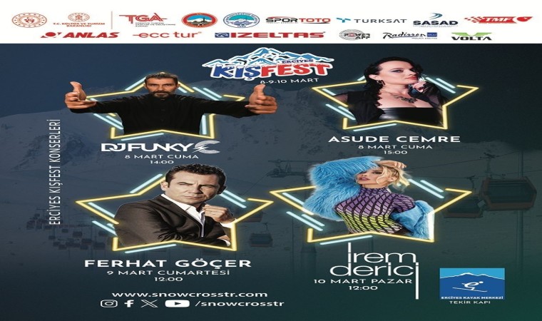 Dünya Motosiklet Federasyonu (FIM) tarafından dünyanın en prestijli yarışlarından biri olarak kabul edilen Dünya Kar Motosikleti Şampiyonası, Cumhurbaşkanlığı himayelerinde, Türkiye Motosiklet Federasyonu destekleri ile Kayseri Valiliği, Kayseri Büyükşehir Belediyesi ve Erciyes A.Ş. tarafından Türkiye’de ilk kez Erciyes’te yapılacak. Dünya Kar Motosikleti Şampiyonası kapsamında Kayseri’nin zirvesinde yapılacak Erciyes KışFest, dev konserler, Dj performansları, eğlenceli yarışlar ve kar oyunları ile 3 gün boyunca eğlenceye doyuracak. Katılımcılar Şampiyona boyunca eğlenceli yarışmalar, spor aktiviteleri, konserler ve birçok farklı aktivite ile hem şampiyonanın hem de kış festivalinin keyfini çıkaracak. 3 gün boyunca pek çok markanın çeşitli aktiviteleri, spor etkinliklerinin de yer alacağı festivalde Ferhat Göçer ve İrem Derici gibi sanatçılar konser verecek. Ünlü sanatçıların sahne alacağı konserler, vatandaşlara ücretsiz olacak. 8 Mart Cuma saat 14.00’te DJ Funky, 15.00’te Asude Cemre’nin sahne alacağı festivalde, 9 Mart Cumartesi 12.00’de sanatçı Ferhat Göçer hayranlarıyla buluşacak. Yine festival kapsamında 10 Mart Pazar günü saat 12.00’de ise sanatçı İrem Derici, sevenlerine coşkulu anlar yaşatacak.