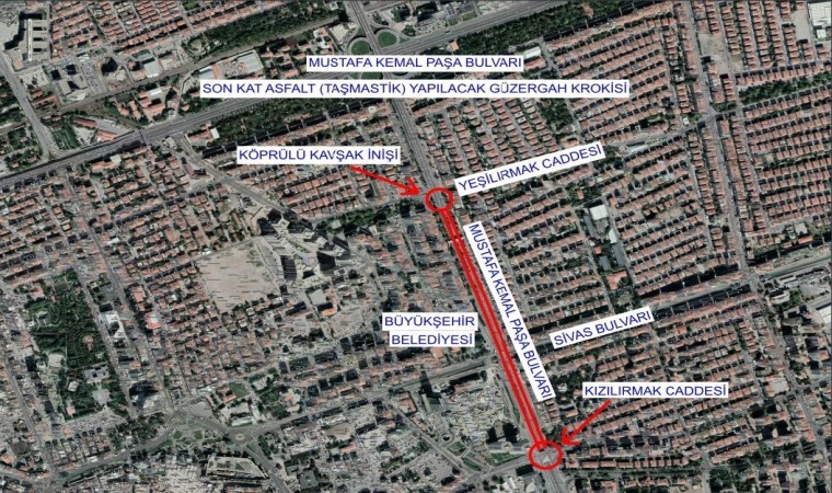Bu çerçevede 9 Ekim 2023 Pazartesi günü başlatılacak çalışmalar ile Mustafa Kemal Paşa Bulvarı’nın Sanayi Odası Önü Köprülü Kavşak inişinden, Kızılırmak Caddesi altgeçide kadar olan 1 kilometrelik kısımda, çift yönlü olarak aşınma tabakası yapılacak. Toplam 1850 metre uzunlukta 2 ila 5 şerit sayısına sahip, genişliği 16 metreyi bulan yolda taş mastik aşınma tabakası serimi yapılacak. İlk olarak Kartal Kavşağı’na gidiş istikametinde işe başlanması planlanırken, 4 gün içinde çalışmaların tamamlanması hedefleniyor. Çalışmalar taşıt trafiğinin en az olduğu akşam 21.00 ile sabah 06.00 saatleri arasında gece gerçekleştirilecek. Bu zaman diliminde sürücülerin alternatif yolları kullanmaları gerekiyor. Bu çalışma ile kış aylarına gelmeden önce güvenli ve konforlu ulaşım altyapısının teşkil edilmesi, farklı dönemlerde atılan asfaltların birleştirilmesi sağlanarak yolun düzenli hale getirilmesi, yoldaki mevcut asfaltın ekonomik ömrünün artırılması hedefleniyor