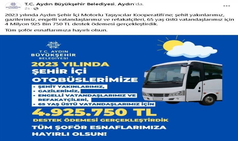 Aydın Büyükşehir Belediyesi tarafından yapılan açıklamada, “2023 yılında Aydın Şehir İçi Motorlu Taşıyıcılar Kooperatifi’ne, şehit yakınlarımız, gazilerimiz, engelli vatandaşlarımız ve refakatçileri, 65 yaş üstü vatandaşlarımız için 4 milyon 925 bin 750 TL destek ödemesi gerçekleştirdik. Tüm şoför esnaflarımıza hayırlı olsun” denildi.