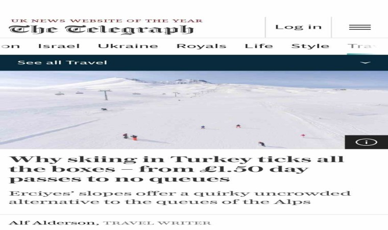 Alf Alderson’un gezi yazıları kapsamındaki geniş yer verilen haberde, 3 bin 917 metre yüksekliğindeki 112 kilometrelik pistleri, 19 modern teleferiği bulunan Erciyes’in, hesaplı aynı zamanda güzel bir keyif sunduğu yer aldı.