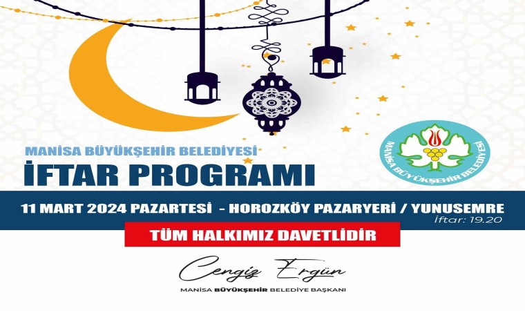 Manisa Büyükşehir Belediyesi’nin iftar sofrası 11, 12, 13 Mart tarihlerinde Horozköy Pazaryeri, 14, 15, 16 Mart tarihlerinde Karaköy Pazaryeri, 17, 18, 19 Mart tarihlerinde Alaybey Pazaryeri, 20, 21, 22 Mart tarihlerinde Nurlupınar Pazaryeri, 23, 24, 25, 26 Mart tarihlerinde Eski Garaj, 27, 28, 29, 30 Mart tarihlerinde Akgedik TOKİ, 31 Mart, 1 ve 2 Nisan tarihlerinde Laleli Pazaryeri, 3, 4 Nisan tarihlerinde Bedesten, 5, 6, 7 Nisan tarihlerinde Cumhuriyet Meydanı ve 8, 9 Nisan tarihlerinde Muradiye Pazaryeri’nde kurulacak. 11 Ayın Sultanı Ramazan Ayı’nın tüm İslam alemine hayırlar getirmesini temenni eden Manisa Büyükşehir Belediye Başkanı Cengiz Ergün, “Ramazan Ayı boyunca vatandaşlarımızla aynı sofrada, birlikte orucumuzu açacağız” ifadelerini kullandı.